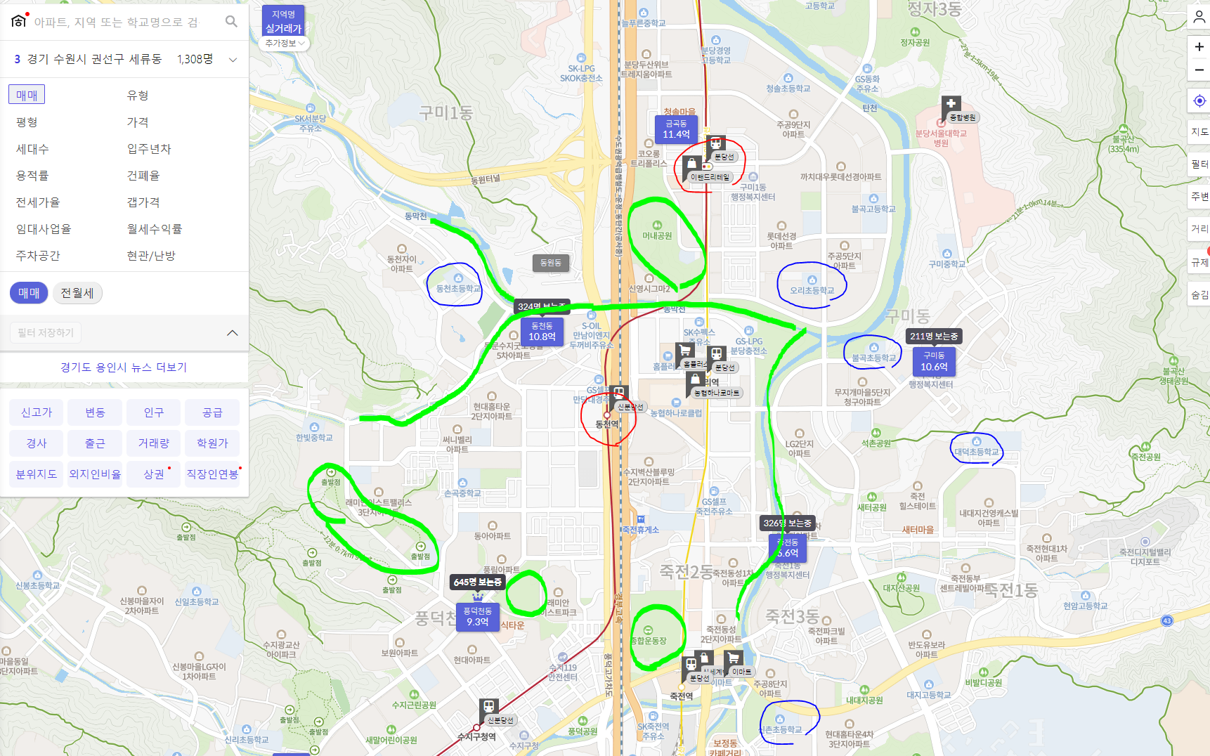 큰 화면에서는 동별로 평균 가격을 보여준다. 현재 동천역주변으로는 평균 10억원대로 가격이 형성되어 있고 오른편 아래 죽전동은 6.6억대이다.