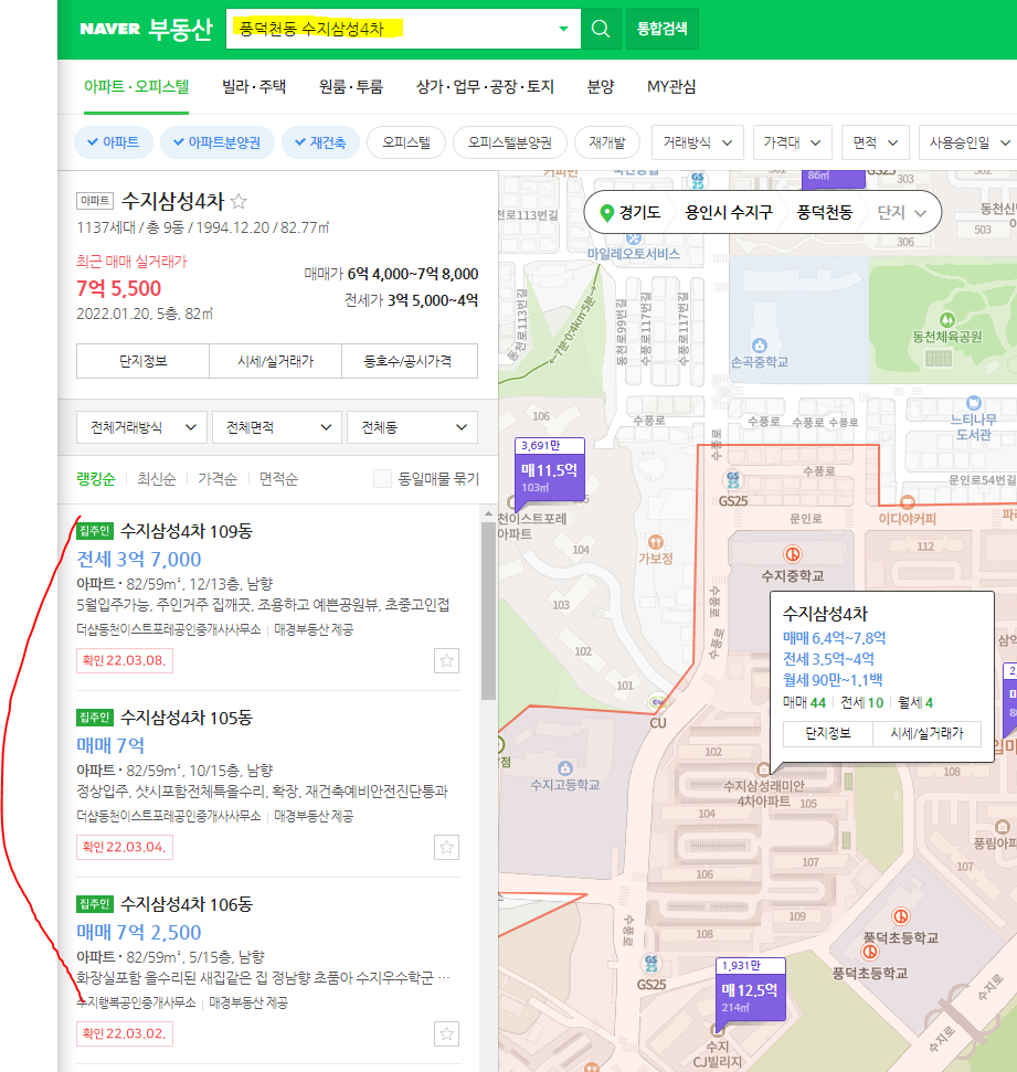 내가 고른 곳은 수지 삼성래미안 4차 아파트를 우선 선정했다.