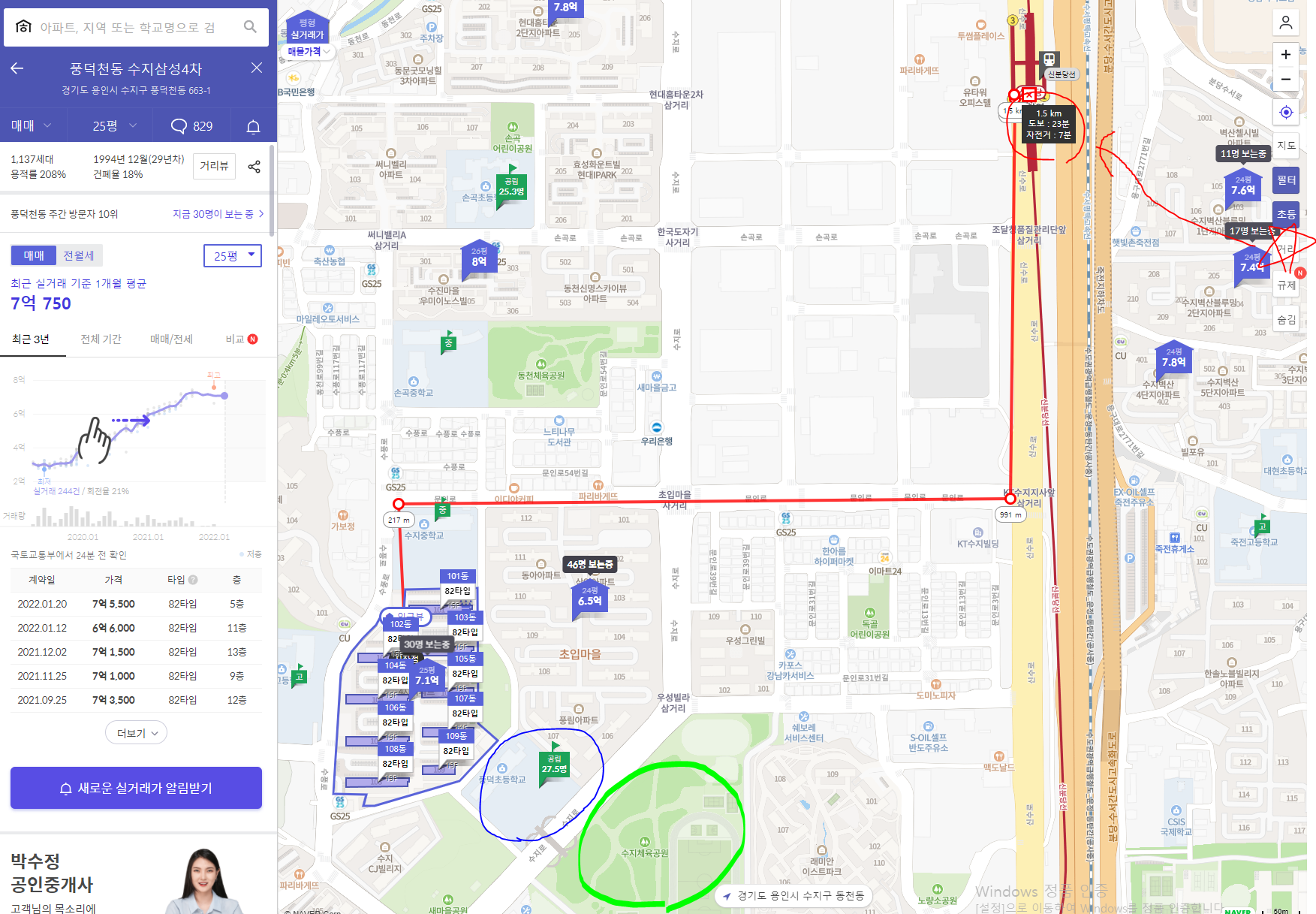 내가 생각하는 조건 중 역에서 23분이 걸려서 조금 멀게 느껴지긴 했지만 초등학교와 공원이 바로 앞에 있고 25평 기준 7.1억으로 예산에 들어온다.